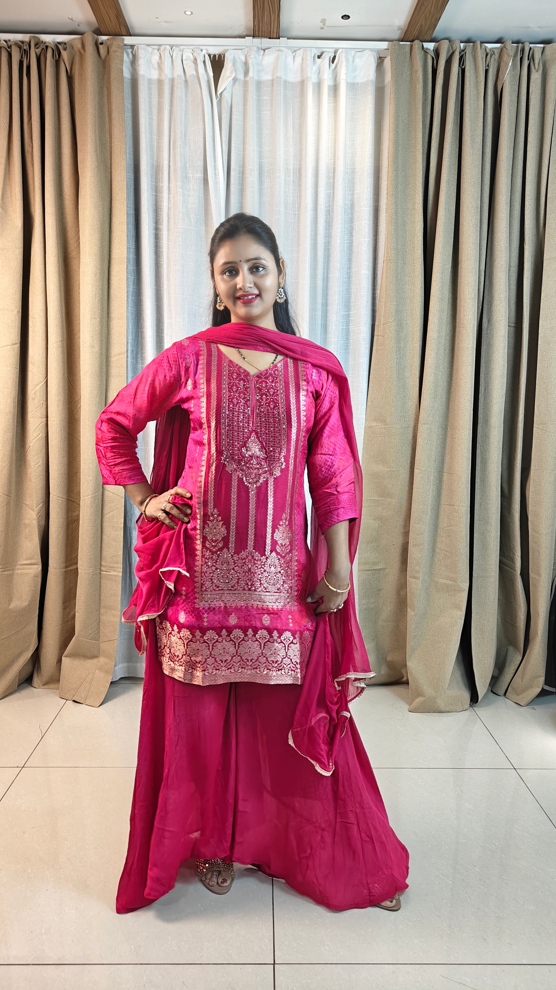 Key Features: • Fabric: Premium silk with brocade detailing • Style: Short kurta + sharara set (3-piece with dupatta) • Color: Hot pink/magenta with gold embroidery • Embellishment: Gold zari brocade on kurta front • Occasion: Wedding, Sangeet, Festive, Mehndi, Eid • Available Sizes: M, L, XL, 2XL