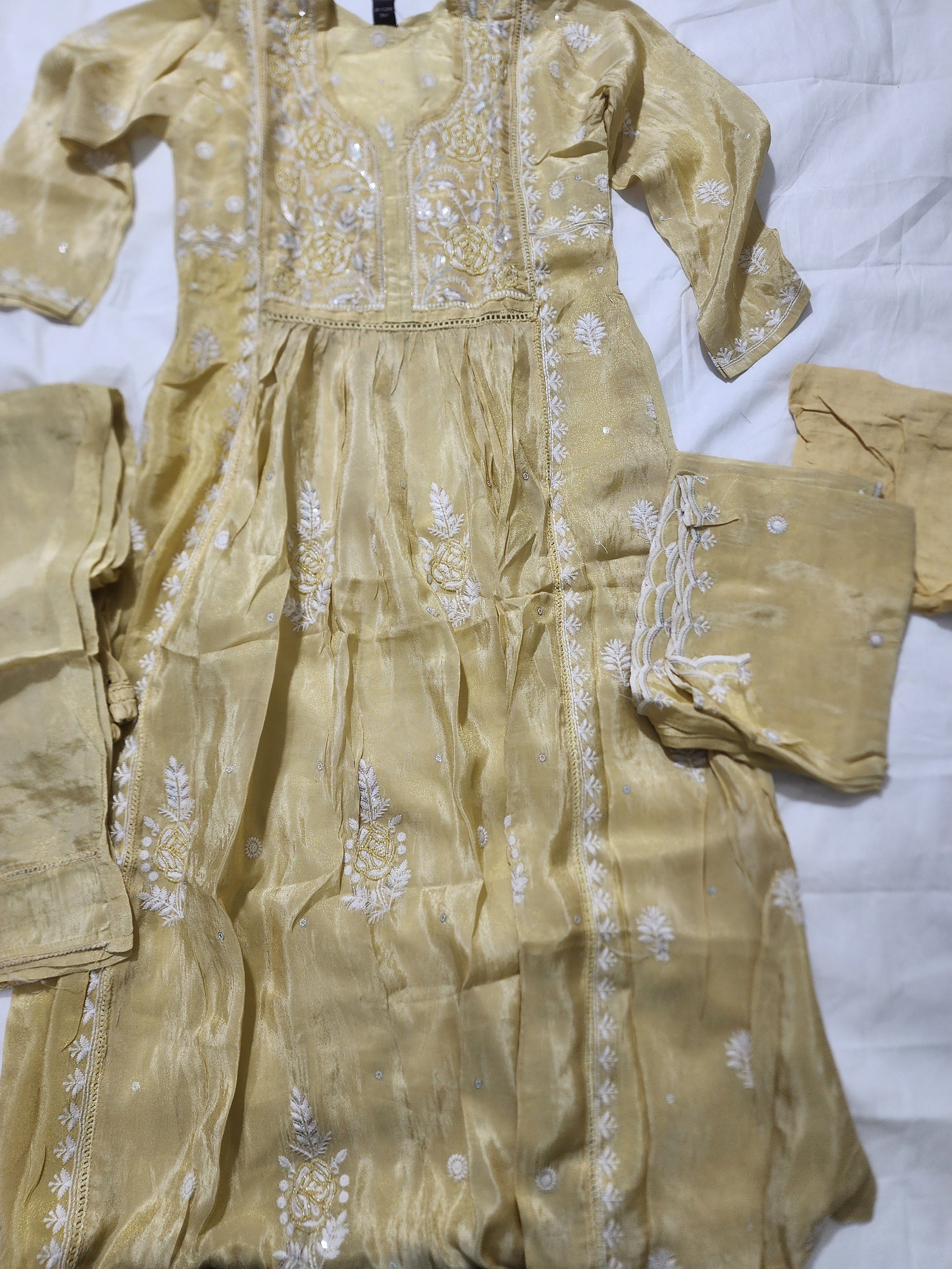 • Style: 3-piece anarkali set — flared kurta + pants + embroidered dupatta